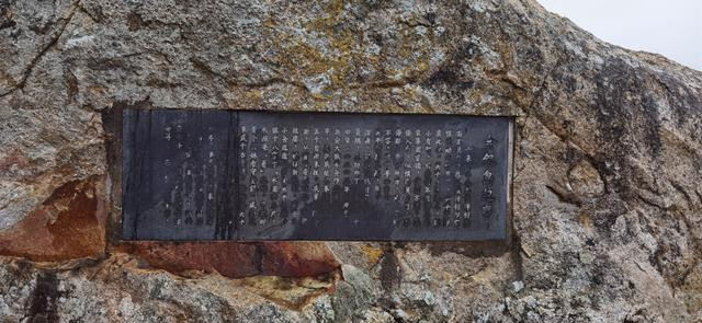 她身旁石壁上嵌着《金银岛纪事》等碑记。周围林立的怪石刻有名家题字的诗文。