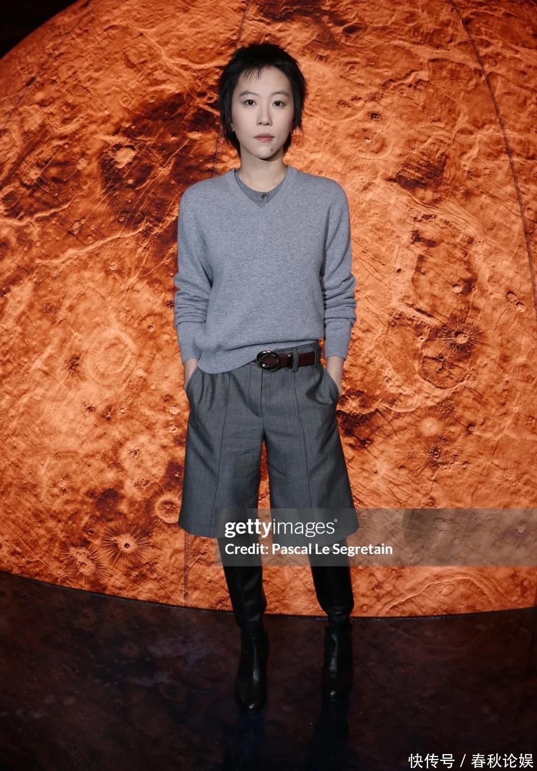 她身穿一件灰色诚挚衫,底下搭配五分西装短裤,脚上衣服一对玄色长靴,打扮的既从简又有立场,看着极度调和。